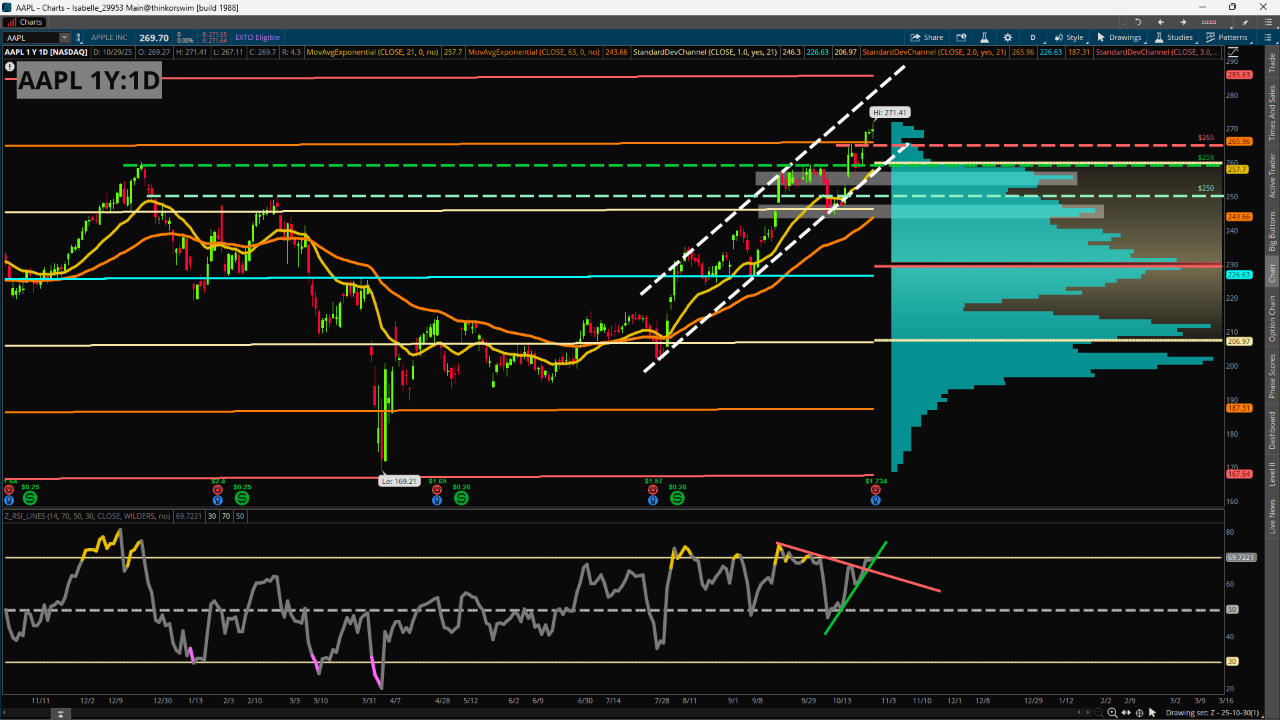 The technical picture shows price traveling upward in a channel shape since its last earnings event in July. Momentum remains high even headings into earnings, with the RSI just on the verge of crossing above the overbought level of 70. Price also continues to stay well above its common moving averages, with the 21-day Exponential Moving Average being one of the closest to current levels just below 258.