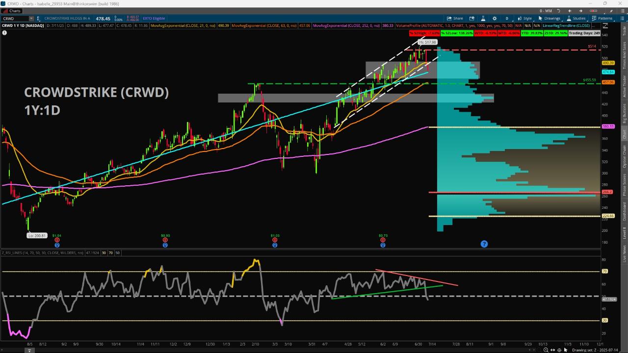 CrowdStrike (CRWD) is down about -2% in premarket trading to kick off the week, as Morgan Stanley downgraded the cybersecurity and software company to Equal Weight from Overweight but also raised its price target to $495 from $490. The firm sees a full valuation with the shares up 50% from the April lows. CrowdStrike still offers a compelling long-term story, but the expected second half of 2025 growth acceleration now looks well priced into the stock, the analyst stated. CrowdStrike shares recently retreated about -7.6% from their all-time highs of $517.98 on Jul. 3, with most of the drop coming from a sharp decline during the past two sessions.