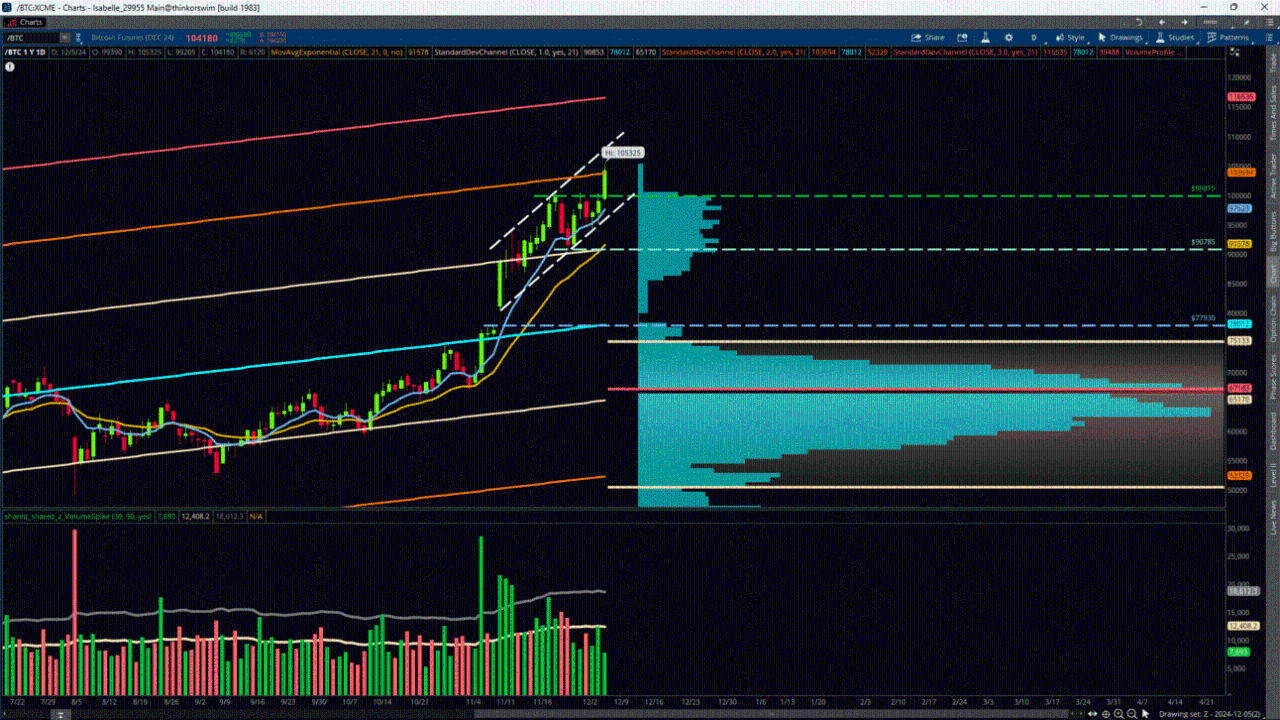 Bitcoin spot and the /BTC futures both have surged to the upside since Bitcoin broke 100K without looking back so far. Traders may consider that a break above a notable resistance level can result in an initial surge to the upside, then a pullback and retest of that same level, so there may be some important downside support points to remember. For the /BTC futures, the 100K level is worth noting, but many traders also likely will be keeping an eye on the previous high close of 99,815. Beyond that, traders may be watching a shorter-term trendline beginning with the lows that were formed after the Nov. 11 gap up near 80,670, which could project potential support near 96K. Resistance is the tricky part now. Price is currently above a notable resistance point in the yearly +2 Standard Deviation Channel, which comes in near 103,694. Beyond that, the +3 Channel is near 116,535.