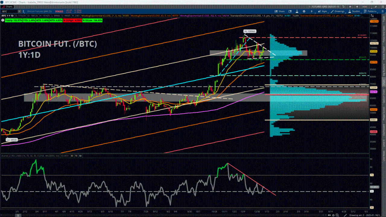 Bitcoin futures (/BTC) have consolidated in recent weeks as traders assess the upcoming inauguration of President-elect Donald Trump on Mon., Jan. 20, which is expected to lead to a more crypto-friendly Securities and Exchange Commissioner in Paul Atkins and then a potential broader overhaul of the SEC’s crypto policies. It’s still unclear how exactly everything will play out from a legislative perspective, but /BTC was up about +43% from the presidential election on Nov. 5 as of yesterday’s close, so traders seem to be feeling more bullish about their prospects for changes to the rules of the game.