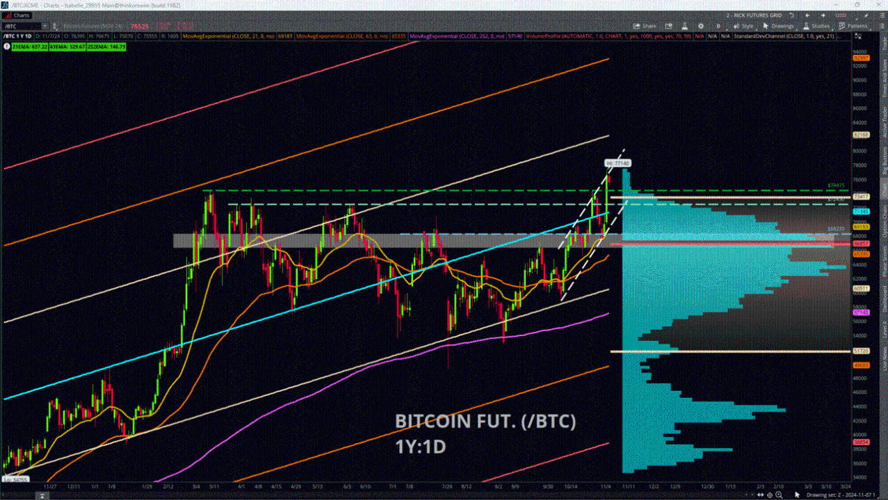 Crypto traders seem to feel bullish about Donald Trump winning the U.S. presidential election, as bitcoin futures (/BTC) surged about +10% yesterday and closed near the new all-time intraday high of 77,140. The contract is now taking a breather and is down about 1.7% from yesterday’s close. Many new traders may be attracted to these bullish charges to the upside that make big headlines, but consider the saga of bitcoin’s extraordinary volatility before you dive in. /BTC was at 4,210 in March, 2020, then rocketed to highs of 69,355 in Nov., 2021 (~+1,600% gain), then collapsed to lows of about 14,925 a year later in Nov., 2022 (~78% loss), and exploded again over the past two years to close at 75,295 yesterday (~+390% gain from Nov. 2022). These are incredibly unusual and extreme swings, so remember that volatility can cut both ways