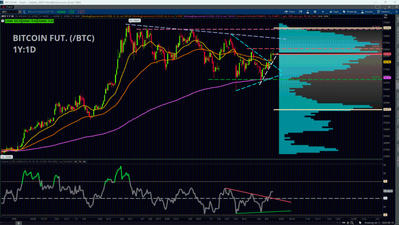 Bitcoin futures (/BTC) have been on the move to the upside in recent weeks, rising more than 19% from the recent lows of 52,820 on Sept. 6 to Friday’s close of 62,940. The rally has driven price upward to surpass several key technical points, but the cryptocurrency is still short of its previous highs on 65,200 on Aug. 26.