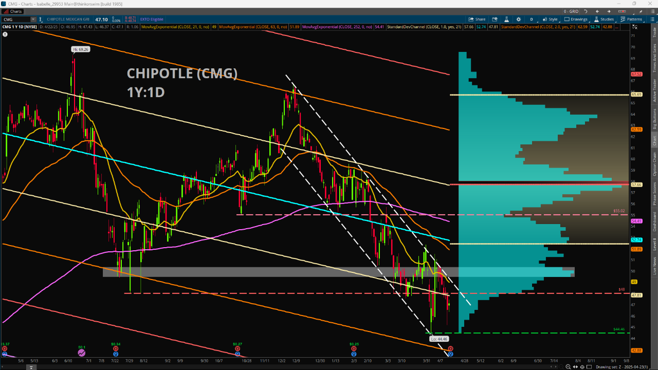 Chipotle closed yesterday at 47.10, which is not far from its 52-week lows of 44.46 on Apr. 7 during the tariff news-related bedlam. But price held above this key level during Monday’s selloff, so it remains an important downside area to watch for potential support if earnings are a miss. Overall, there are few signs that the trend is doing anything to break out of the downward channel pattern beginning with the highs near 66 on Dec. 12. Many common moving averages are trending down with the shorter-length ones continuing to diverge from the longer-length ones, which suggests the downside trend has not changed. Momentum recently showed some bullish divergence from mid-March to early April according to the Relative Strength Index (RSI); however, this may be misleading, as RSI commonly slows down heading into known event risk situations like earnings with potentially high levels of uncertainty.