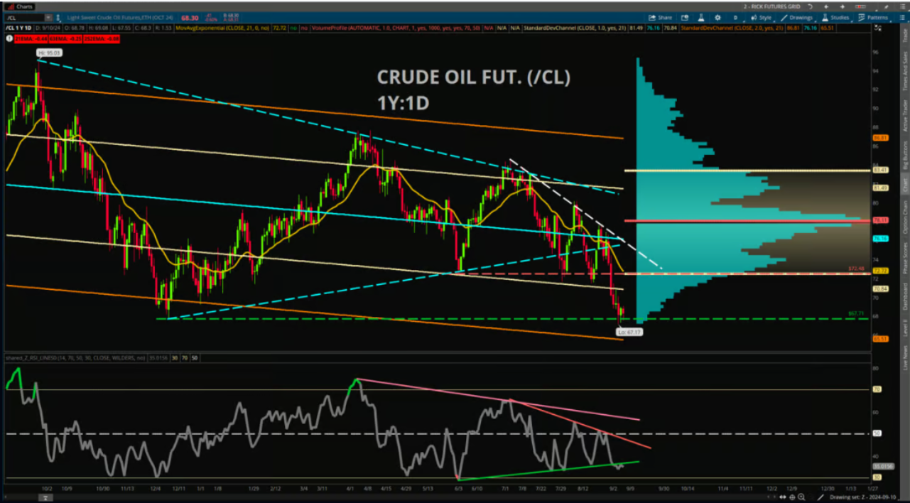 Crude oil futures (/CL) have seen a notable drop in recent weeks, plunging about -11.3% from the high point of 77.60 on Aug. 26 to yesterday’s close of 68.80 and making new 52-week lows along the way. Additionally, last week’s -7.45% weekly decline made for the /CL contract’s worst week since October 2023, and softer premarket trading is showing the potential for further weakness today.
