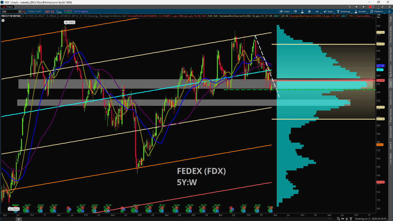 FedEx’s (FDX) stock price sits at the edge of knife as the shipping and transportation company is poised to release its quarterly earnings statement this afternoon after a bruising four-month decline sent shares falling about -20% off the Nov. 25 highs. Shares of FDX last week hit 239.50, the lowest level since Feb. 2024, but now have rallied back above a key area that recently was breached; a general supportive zone of old lows from May and June of 2024 near 244. Generally speaking, this type of situation in which price is near a key support level coupled a major potential catalyst like earnings looming is where potential breakouts can develop if those extreme lows get breached.