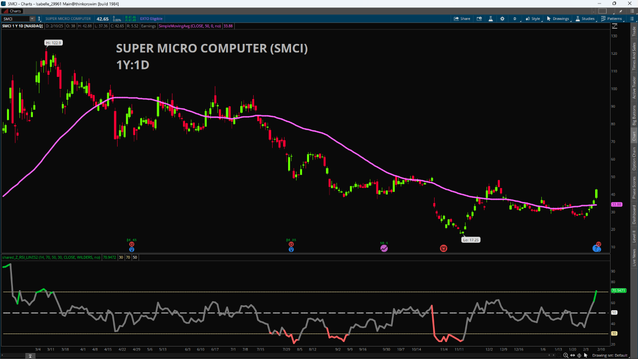 Super Micro’s stock has risen nearly 40% this year but is still down 39% from year ago levels as of Monday’s closing price. It’s also down 65% from its all-time high of $122 per share hit last March. It has rallied back above its 50-day Simple Moving Average and is up nearly 50% in February, so traders are optimistic the business update is going to be positive for the stock. The Relative Strength Index (RSI) is sitting at the 70 level as of Monday’s close, which is right at overbought levels on a technical basis.
