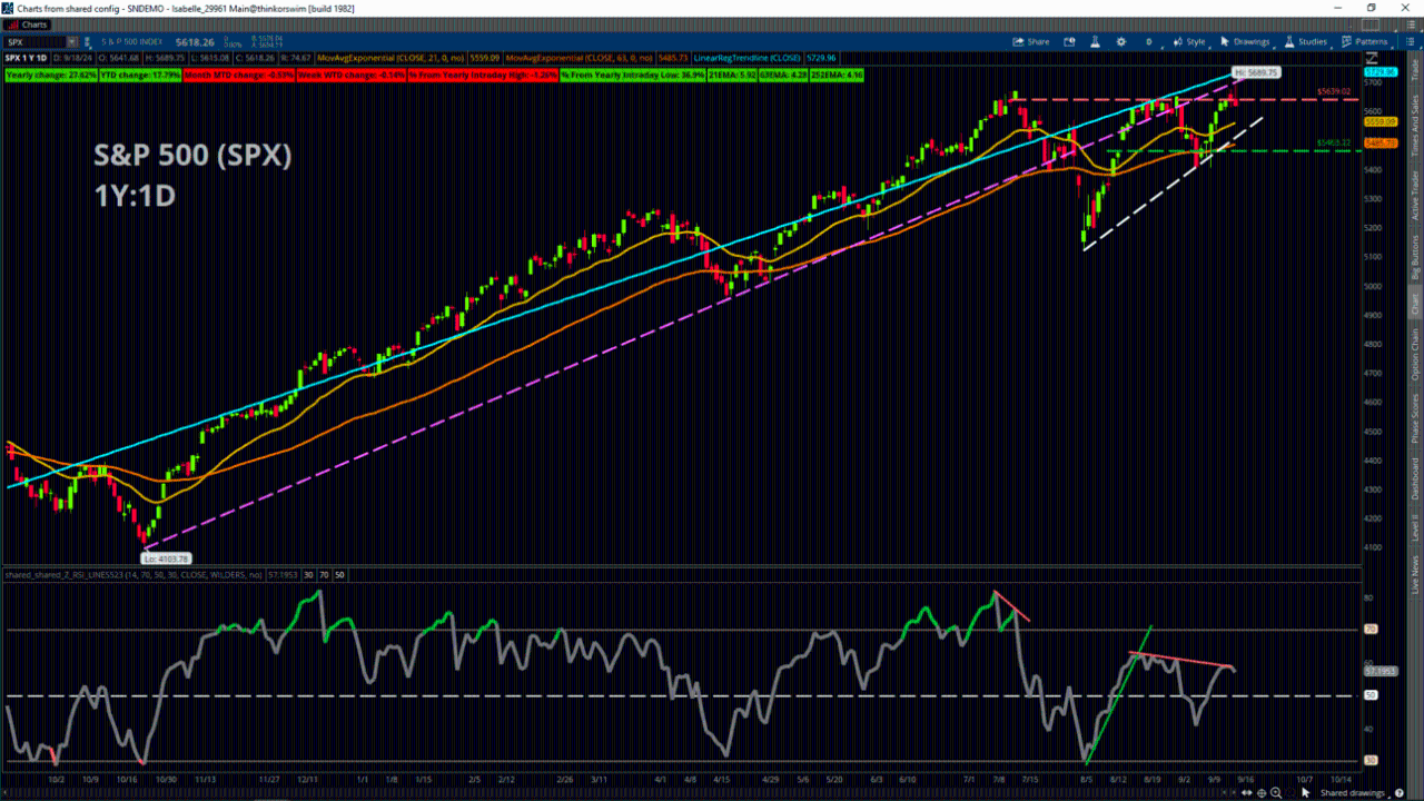 If price continues to rise, traders could potentially look for upside resistance on the SPX at the site of the yearly Linear Regression Line. This is a line of best fit based on closing prices and represents an idea of “fair value” for traders, and comes in near 5,730 under the current conditions in the premarket. For support, if futures do hold true to the upside and the SPX gaps up, look to the previous set of closing highs roughly around 5,640. Beyond that, consider the 21-day Exponential Moving Average at roughly 5,559 in the premarket.
