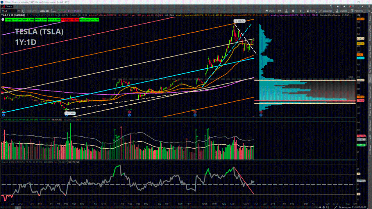 Regardless, TSLA shares are up in premarket trading. The stock price has pulled back about -13% from the all-time highs of 488.54 on Dec. 18, but held the previous lows near 377 and rallied during the past week to close just below the yearly +1 Standard Deviation Channel near 430 on Friday. The price action broke through a shorter-term downward sloping trendline that began with those all-time highs and also held on above the 21-day Exponential Moving Average, now sitting in the thick of the most notable volume node until all the way back down to near 345. Momentum is also improving along with price, as the Relative Strength Index (RSI) broke its own short-term downward trendline and is holding on above the 50 midline.
