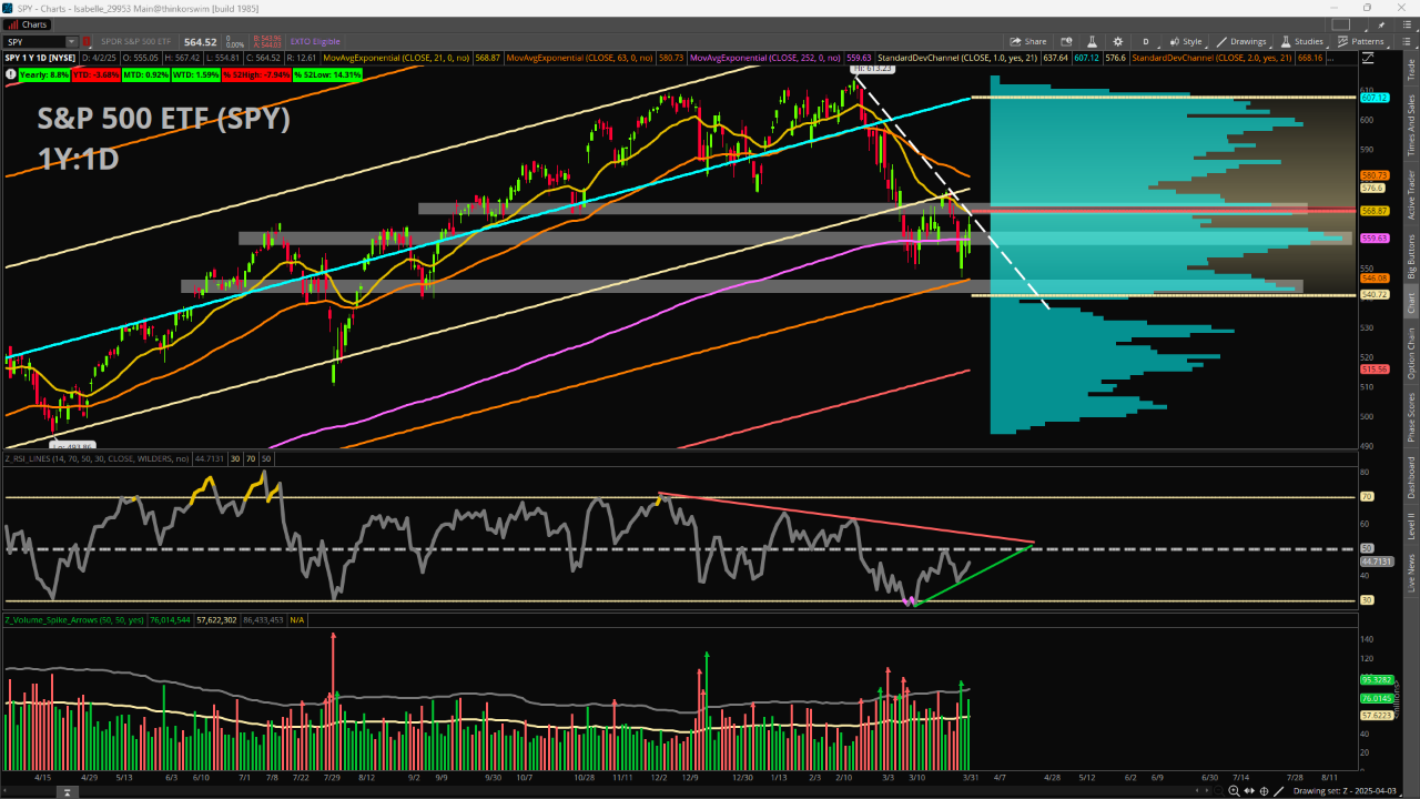 The SPY is poised to open near 543, which is about -11.5% down from its all-time highs of 613.23. According to the yearly Volume Profile study, this downswing has taken price below the Point of Control (area of heaviest trading volume) near 569. It looked like price yesterday was making a move to retake another key volume node near 560, which happened to line up with the long-term 252-day Exponential Moving Average – but today’s move seems likely to be a bucket of cold water for a further rally.