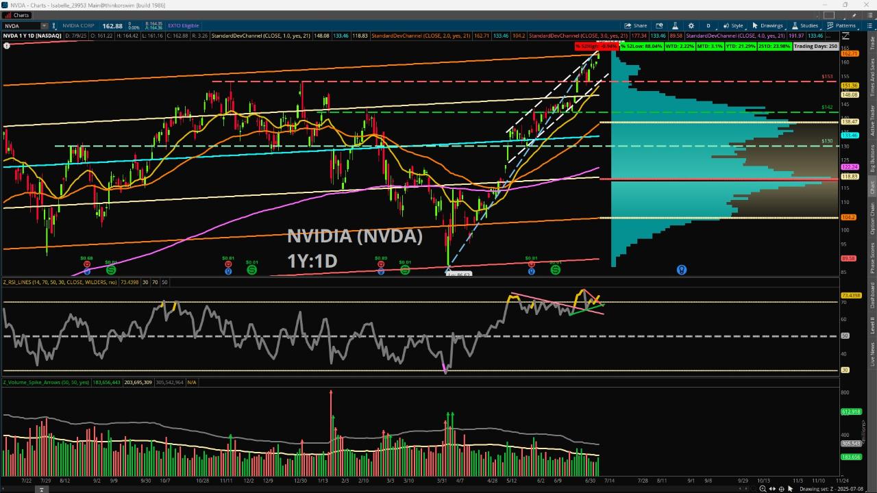 Nvidia (NVDA) shares are once again on the move to the upside in early trading after hitting fresh all-time intraday highs of $164.42 after a +1.8% rally yesterday, as the semiconductor and artificial intelligence juggernaut became the first company in U.S. history to reach a $4 trillion market cap. This latest high marks a sharp +88% rebound from the 52-week lows of $86.62 during the tariff news announcements in early April.