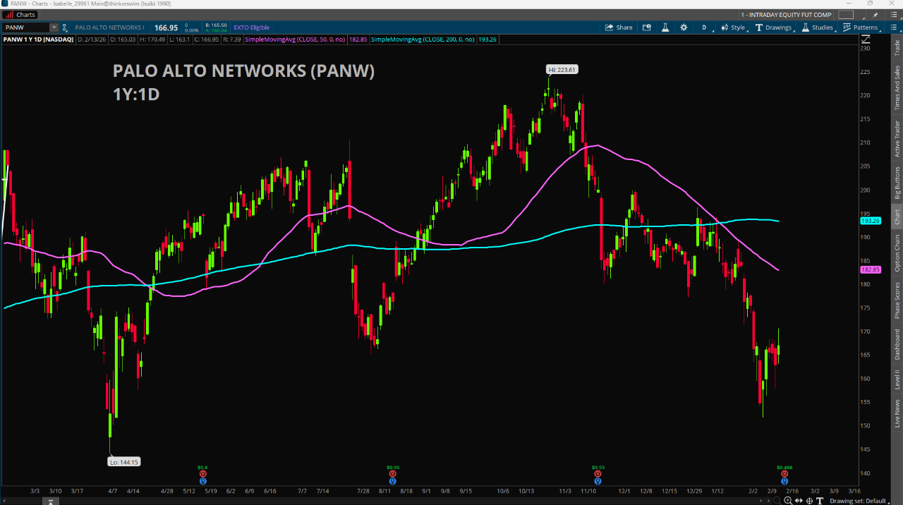 Palo Alto Networks (PANW) reports earnings after the close today and the bar is low going into the report. The stock has fallen 25% off its all-time high of $223.61 from late October. Palo Alto shares are in bear market territory as the market reassesses the threat that generative artificial intelligence (AI) poses to many existing businesses. While software stocks have taken the brunt of the AI sell-off, cybersecurity stocks have been repriced amid fears that AI developers will be able to replicate their capabilities for less.