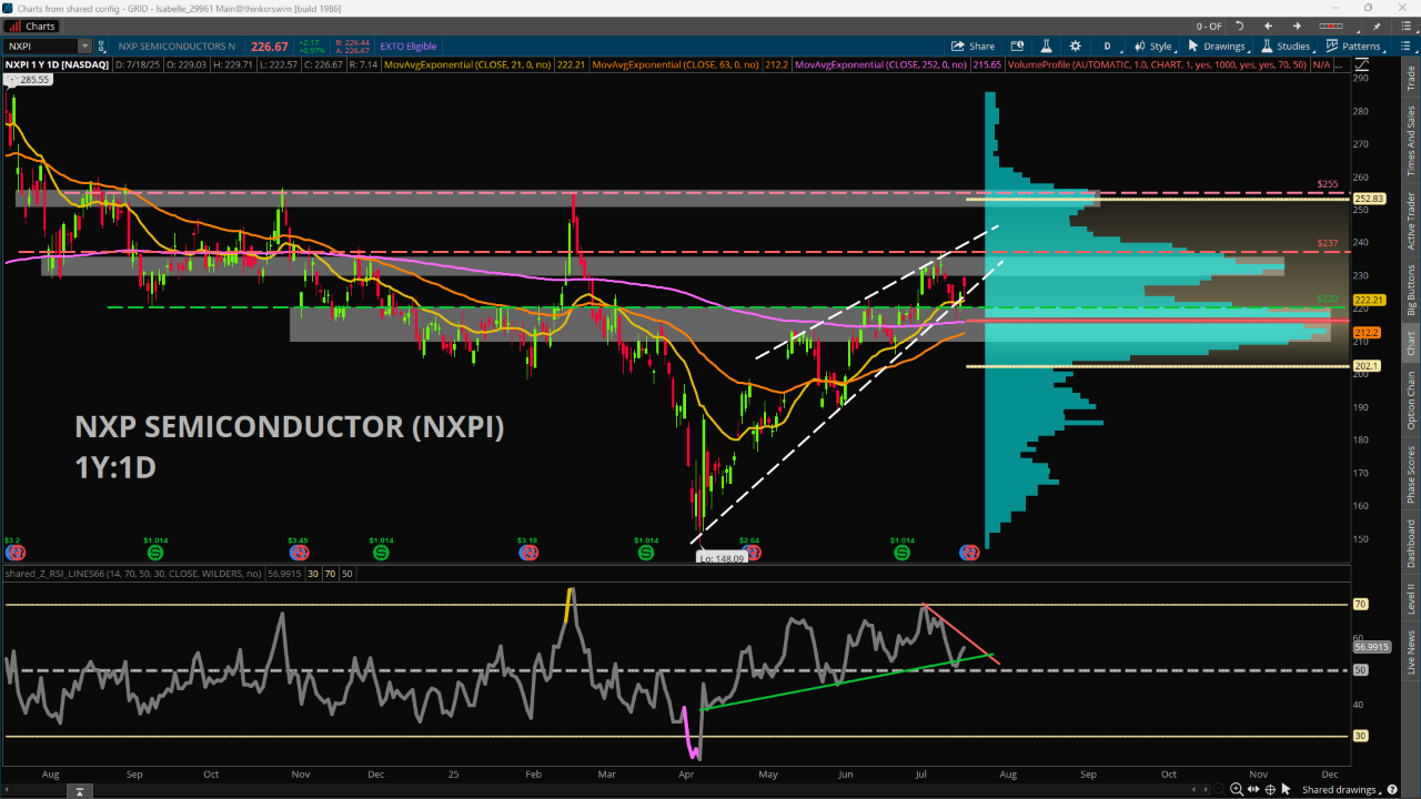 From a technical perspective, NXP has previously encountered resistance around the 237 area, most recently on July 10 as price reached the upper boundary of a rising wedge-type shape before retreating back to prior support near 220. A volume node near 235 also could present a potential slowdown area. Beyond that, 255 marks a repeated highwater mark the bulls have been unable to break. To the downside, several major moving averages, such as the 21-day, 63-day, and 252-day Exponential Moving Averages, are clustering together between about 212 to 222. This area also includes the yearly Volume Profile Point of Control at about 216, so this could be a notable supportive zone.