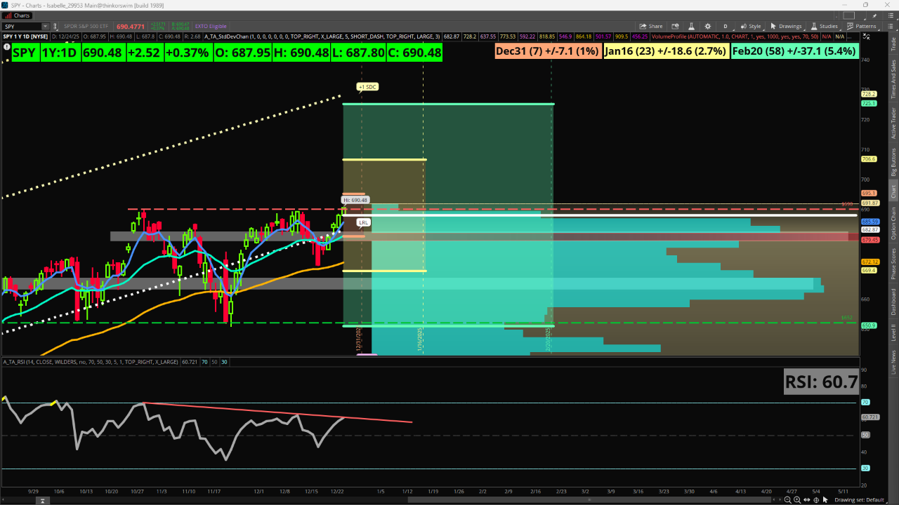 The options market shows a potential expected move of around +/-1% for the quarterly options expiring on Dec. 31. Meanwhile, the Jan. 16 and Feb. 20 monthly contracts show potential moves of 2.7% and 5.4%, respectively. The lower edge of the February move lines up closely with old support near the 652 level, so this could be a key area in the coming weeks.