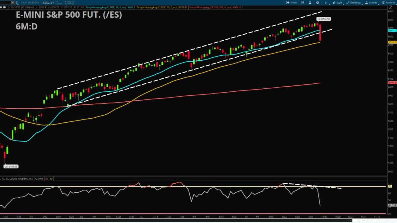 The S&P 500 broke several key technical structure levels that had been in place for months. The bullish ascending channel that’s been intact since mid-March was broken, along with the 20-day moving average. Looking at the E-mini S&P 500 futures contract, it approached the 50-day simple moving average after another sharp post-close selloff on Friday.