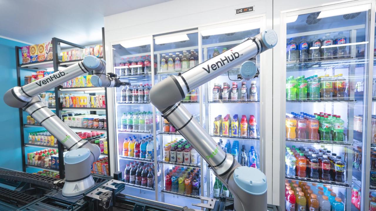 The stores, which VenHub says can be deployed within days, are steel and bulletproof glass boxes with shelves of products inside. Robotic arms collect orders made on customers’ apps and deliver them through vending machine-like doors.