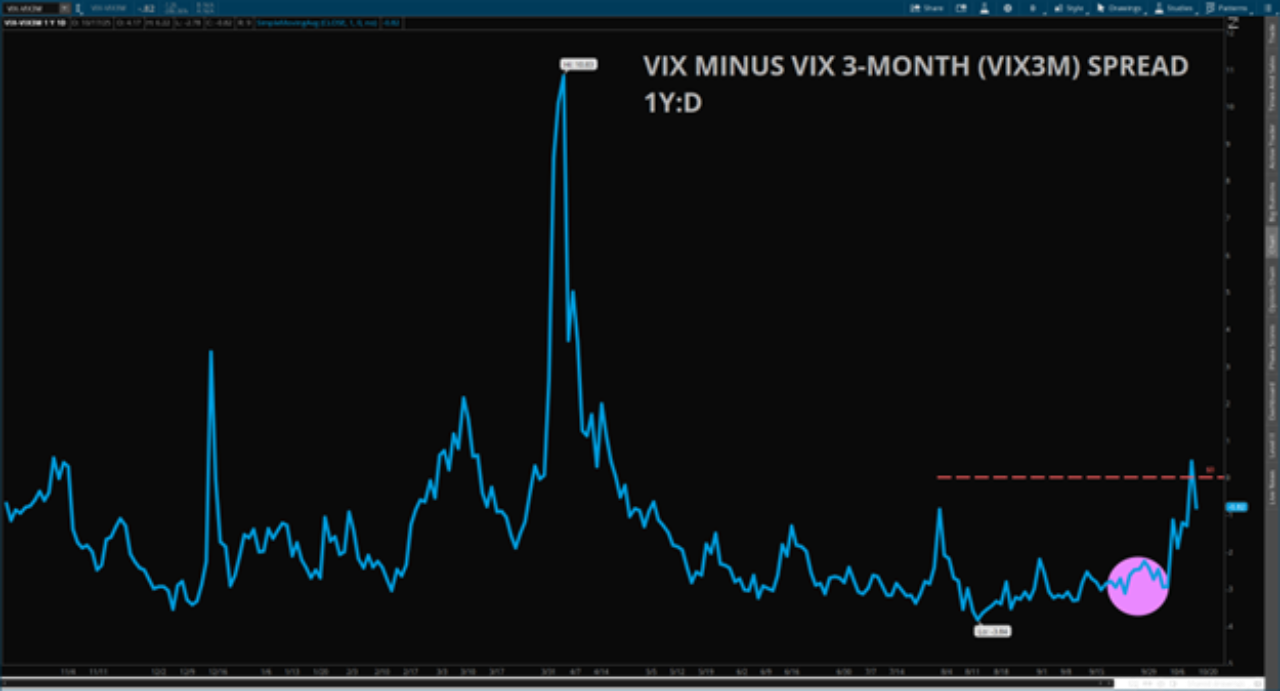 The CBOE Volatility Index (VIX) currently sits slightly above the 20 level. For the first time since around the April lows, the VIX — which measures implied volatility in the S&P 500 — had been priced higher than the 3-month VIX (VIX3M). This is known as backwardation, which occurs when near-term risk or uncertainty is greater than that priced into longer-dated contracts.
