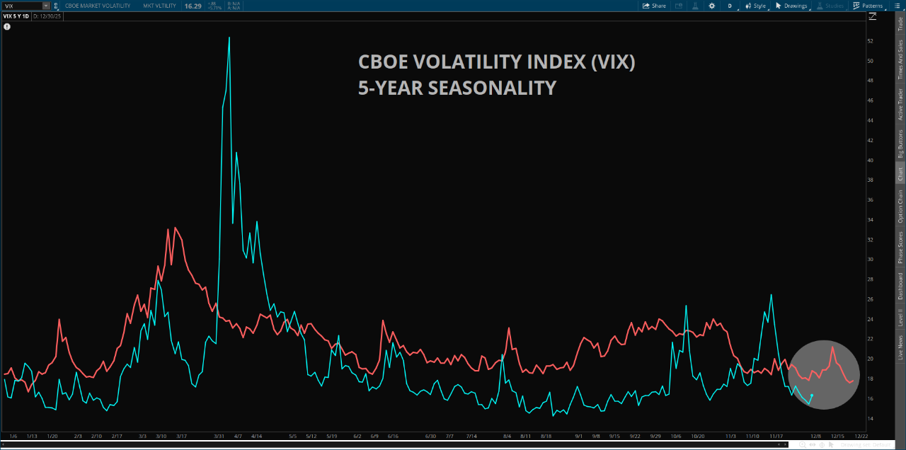 While the market is positioning for a Santa Claus rally from a seasonality standpoint, volatility, measured by the VIX, traditionally rises over the next week. Today’s move higher in the VIX appears largely mechanical rather than a reflection of traders actively bidding for volatility, as the index is now fully priced off January SPX options, which carry higher premiums for the out-of-the-money strikes feeding into the VIX calculation.